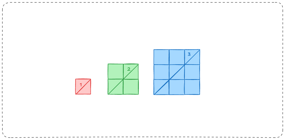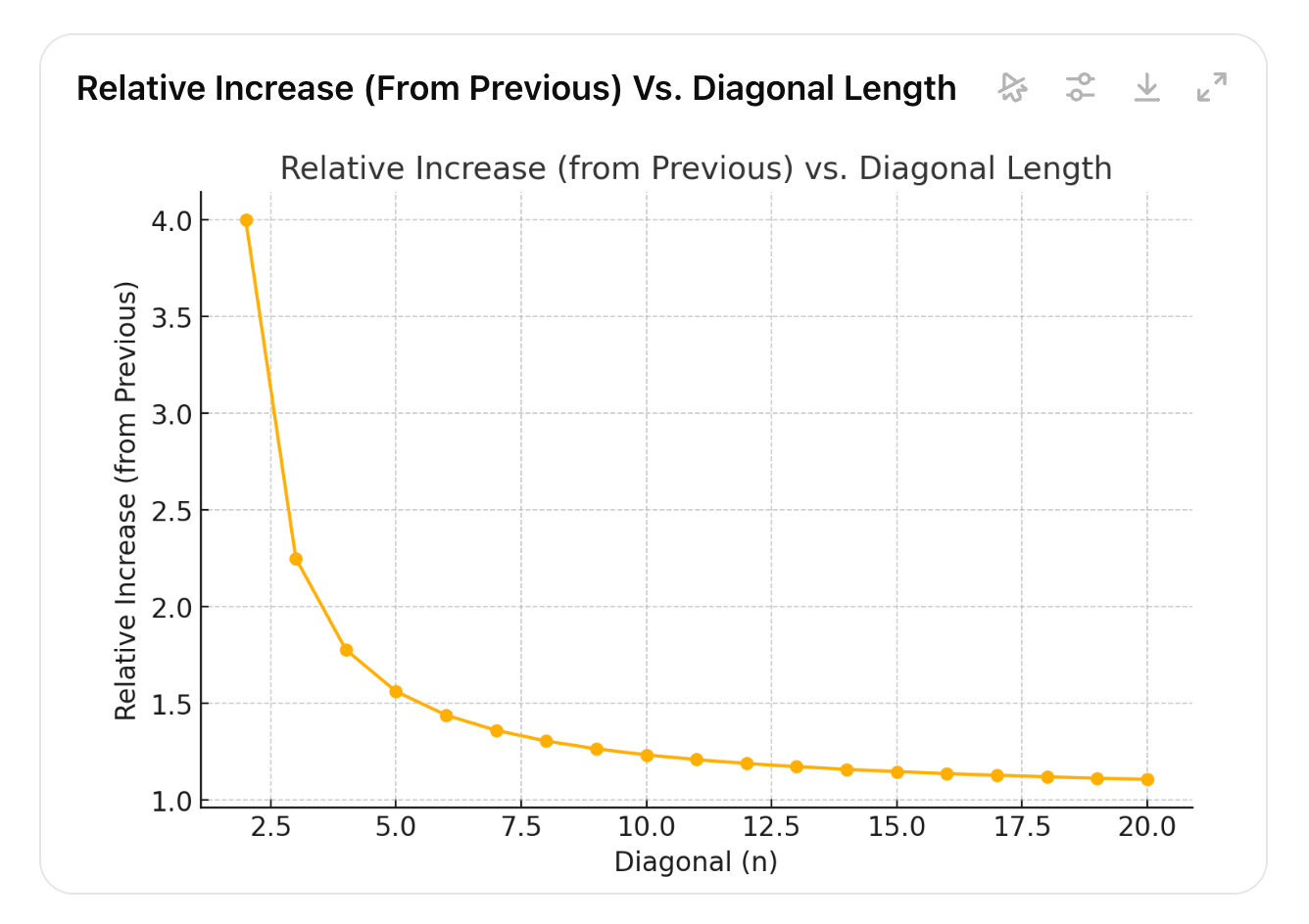 | Diagonal (inches) | Area (units) | Relative Increase (from 1-inch) | Relative Increase (from previous) |