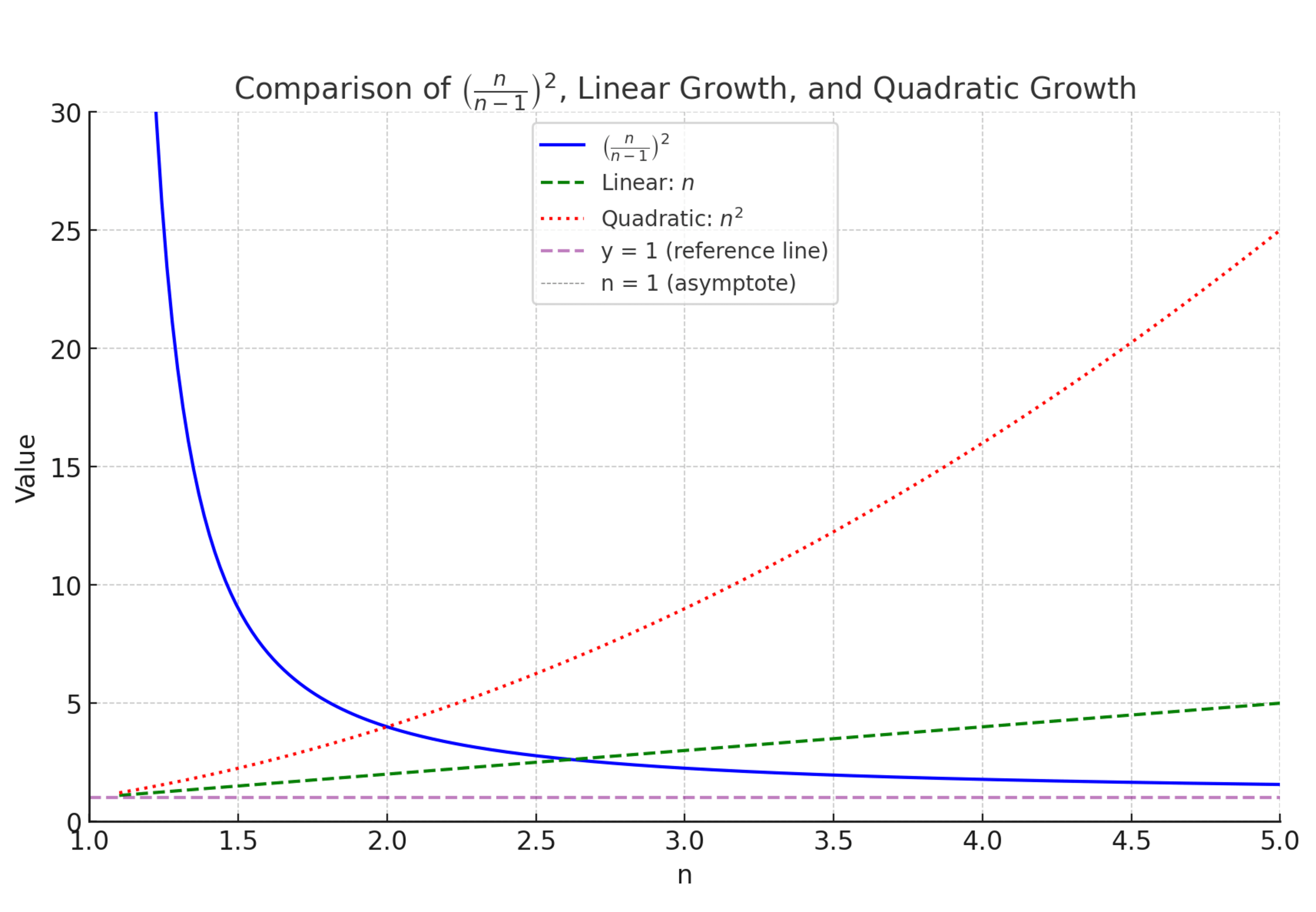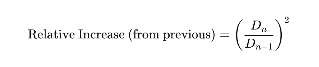 The relative increase graphed above shows a function of diminishing returns, while the actual behavior of the relationship is one of quadratic growth.