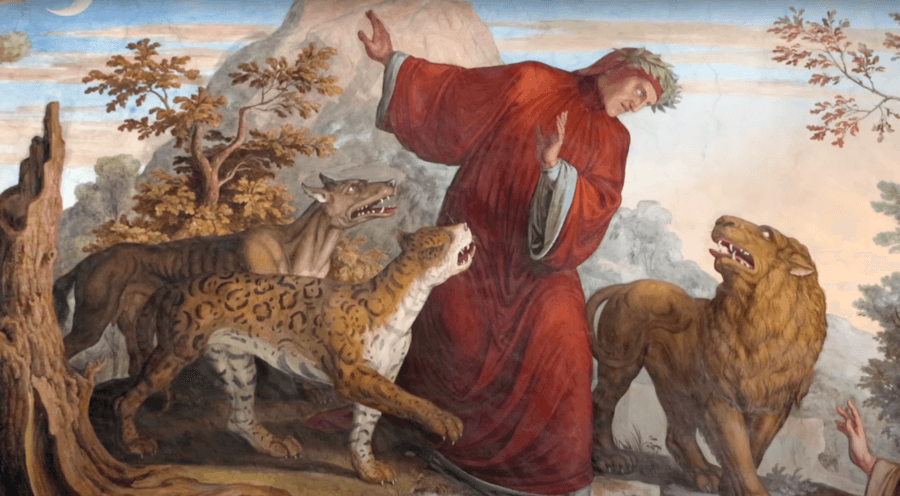 Our journey begins with Dante in a dark forest. He finds himself lost, both literally and metaphorically, as many of us also do throughout life. Ahead he spots a mountain, a possible way out, and makes his way towards it but is blocked by three beasts: A leopard, a lion, and a wolf. He retreats back into the forest.