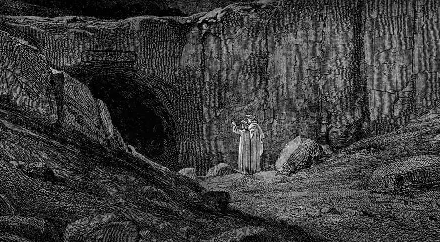 Virgil guides Dante through the forest until they arrive at Hell’s Gates. Ascribed above the entrance is the classic line: