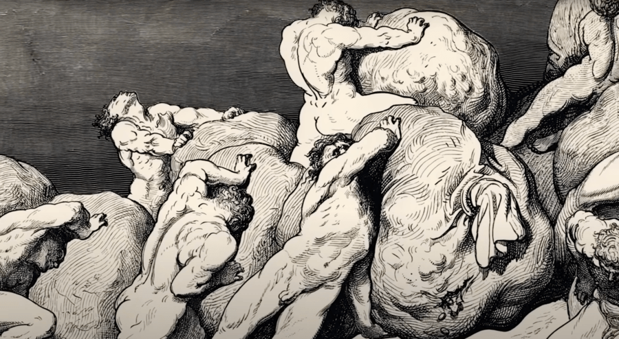 Here the punishment is a futile eternal struggle. The souls here must roll massive boulders, clashing with one another in eternal conflict.