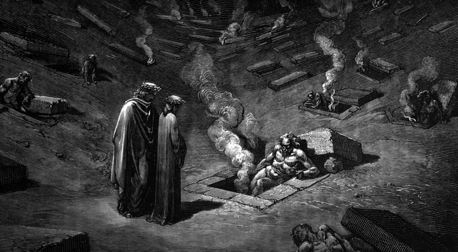 As Dante and Virgil walk through the city, they read the names on the heretic tombs. Kings, Rulers, Generals, Philosophers, Priests. There is no mercy for the unfaithful.