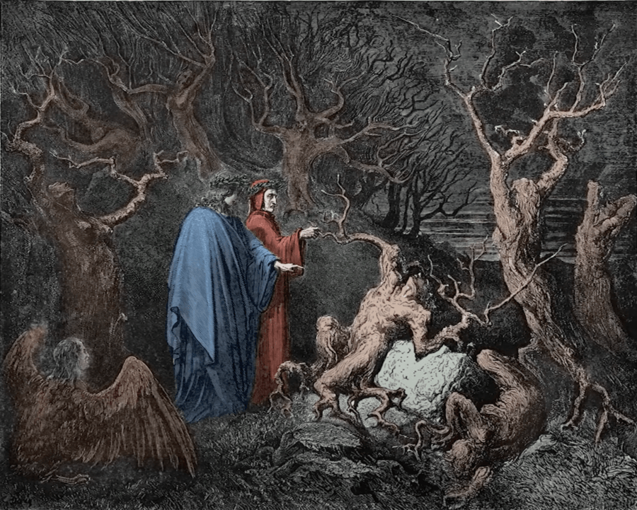 Those who harmed themselves are transformed into twisted gnarled trees, forming a eerie dark forest. Those who commit suicide will be found here, horribly deformed by their own hands. They are stripped of their humanity since they rejected it in life. Among the branch are the Harpies - vicious bird women - who tear at the flesh of the trees and cause them to bleed.