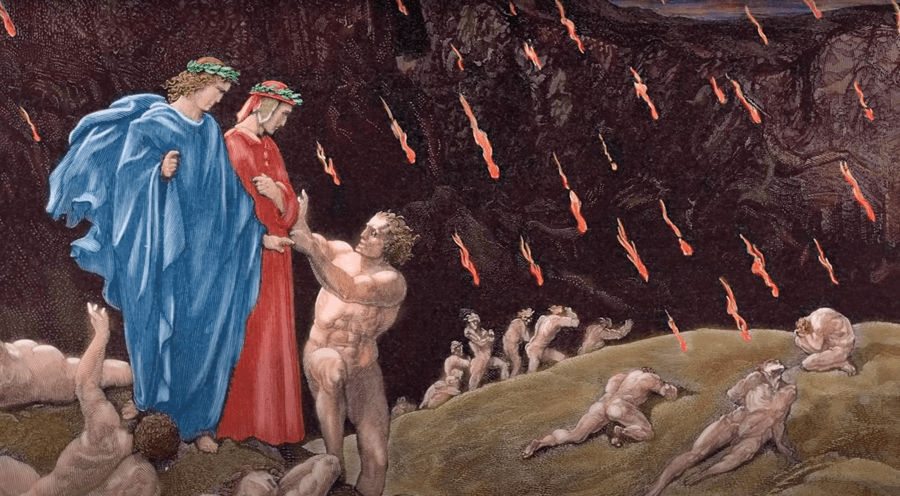 Those who harmed God, through blasphemy and other acts of sacrilege are cast onto a plane of scorching sand and flaming rain.