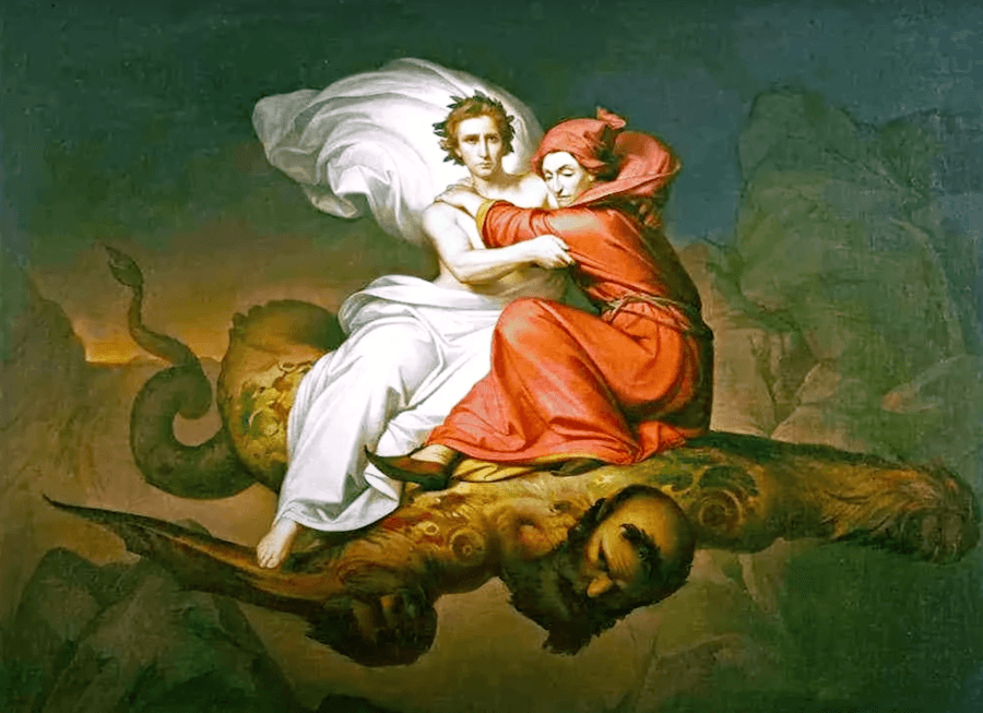 There is a chasm separating the 7th and 8th circles, so Dante and Virgil need to ride a creature called Geryon over to it. Geryon is the monster of fraud - having the face of an honest man, body of a serpent, claws or an eagle, and a scorpion stinger on it’s tail. It’s face hides the hidden danger behind, just like a fraud.