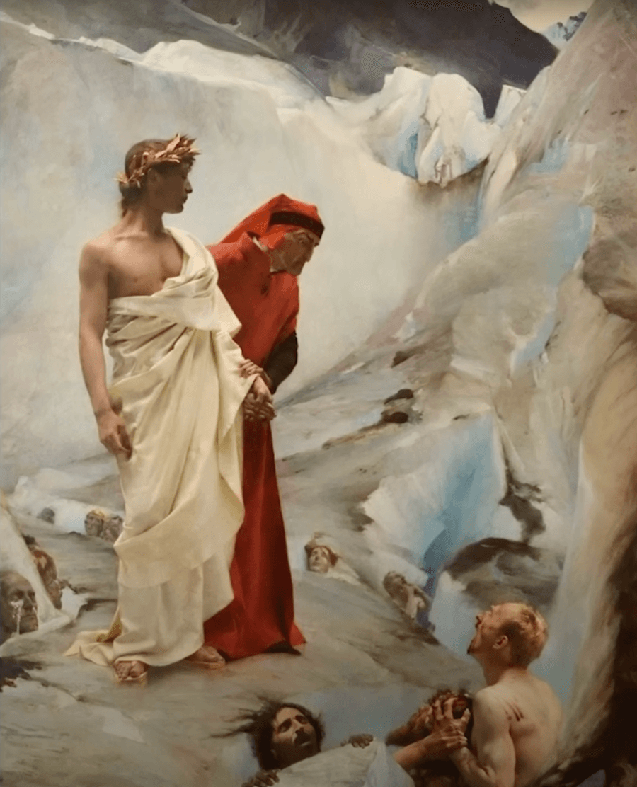 Dante and Virgil must navigate across a massive frozen lake called Cocytus, within which are countless frozen souls. The lake is divided into four distinct zones.