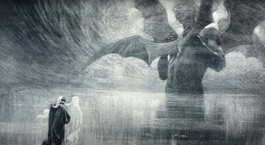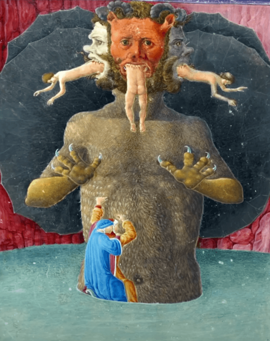 He is frozen from the waist down, with his great wings flapping, and possessing three heads, a cruel corruption of the holy trinity. He not the king of Hell in Dante’s story, but another prisoner. Helpless and trapped like everyone else, for his rebellion against God.