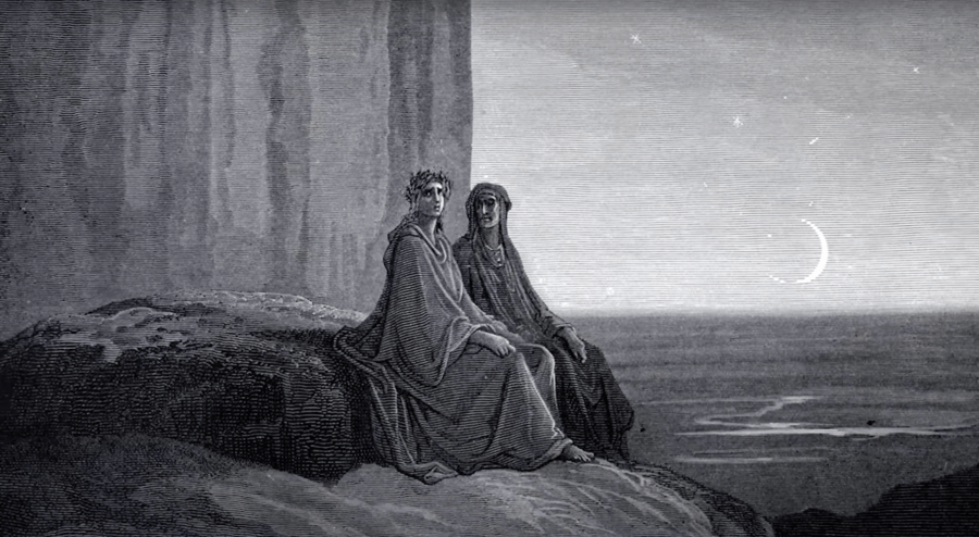 To leave Hell, Dante and Virgil climb down the body of Satan through the very center of the earth. After a long and grueling climb out the other side, they finally emerge at the base of a mountain in an endless ocean.