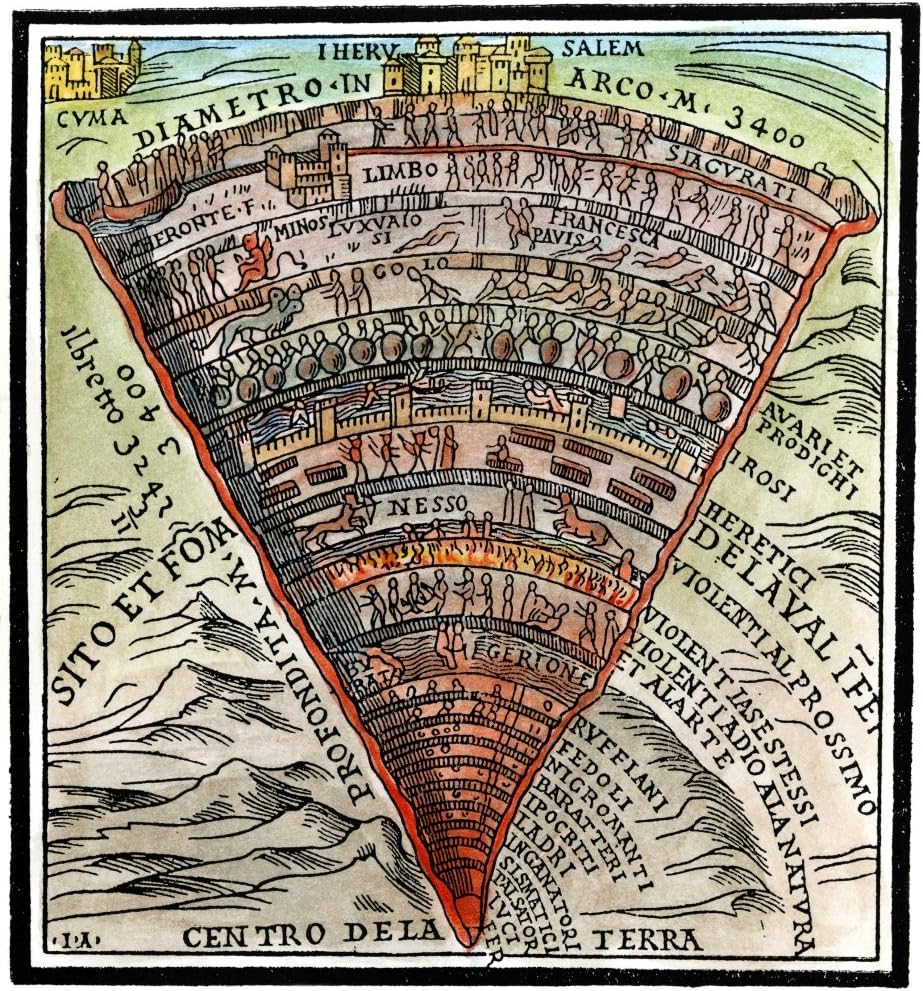 Dante describes Hell as a vast funnel, boring deep into the earth. It is formed of nine concentric circles, each reserved for a particular category of sin.