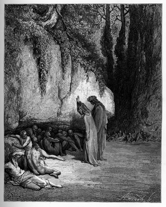 Dante and Virgil are not quite within Purgatory yet. The place they have arrived to is a sort of waiting ground called Ante-Purgatory at the foot of the mountain. Dante’s beloved, Beatrice - who sent Virgil in the first place - awaits Dante at the top of the mountain.