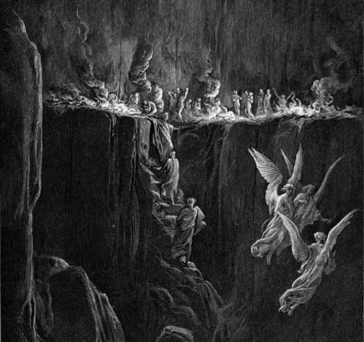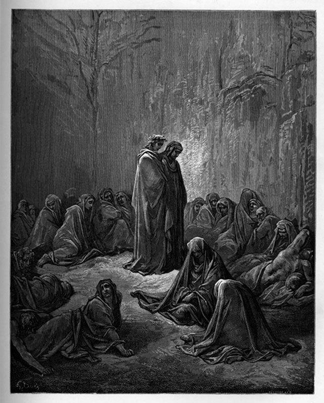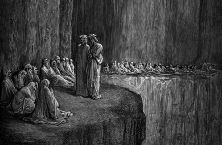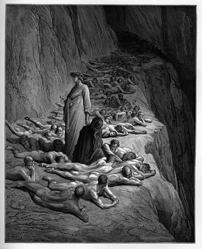 On the fifth level, Dante sees an uncomfotable sight - bodies strewn about on the ground, eyes fixated on the ground.