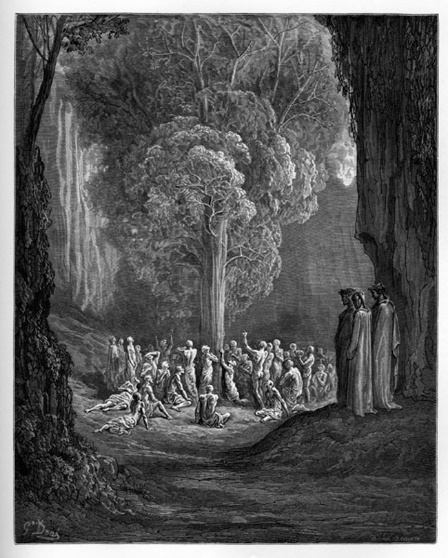 The three poets now arrive at the sixth level and see trees with bright fruits. Around the base of the trees, starved souls gather - their hollow eyes fixed on the fruit above.