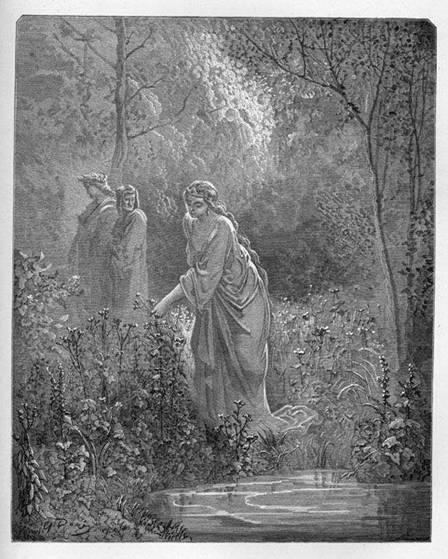 Dante has purged himself of all sins and arrives at the top of the mountain - The Garden of Earthly Paradise. This garden mirror the Garden of Eden.
