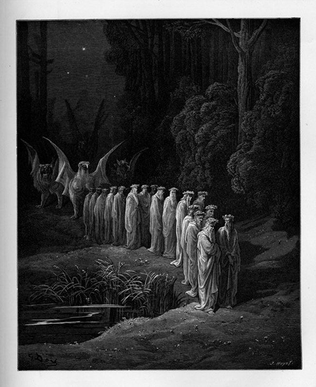 Dante then witnesses The Grand Procession - basically a big parade of Christian myth and the Triumph of Christ. Lots of characters from the Bible are here, like the seven candelabra (seven gifts of the Holy Spirit), twenty-four elders (books of the Old Testament), and the four living creatures (the four Gospels).