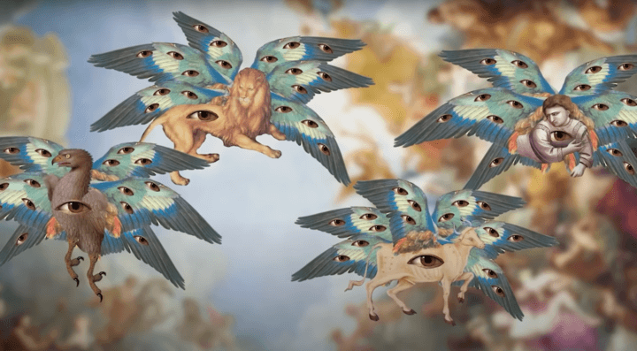These four creatures, by the way, from the book of revelations are divine beings who will one day initiate the end of the world.