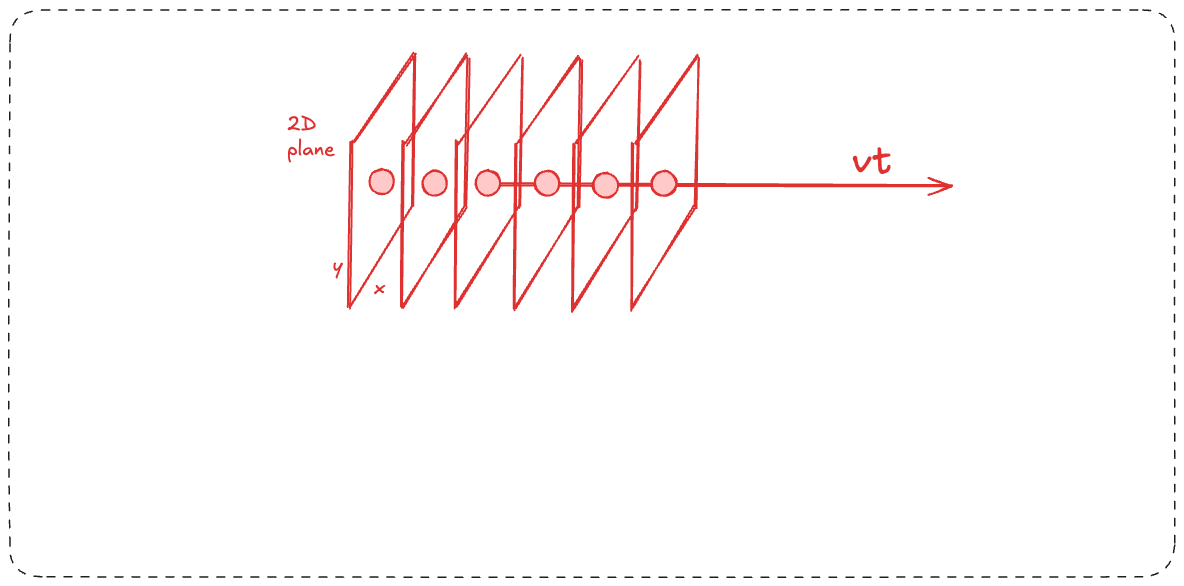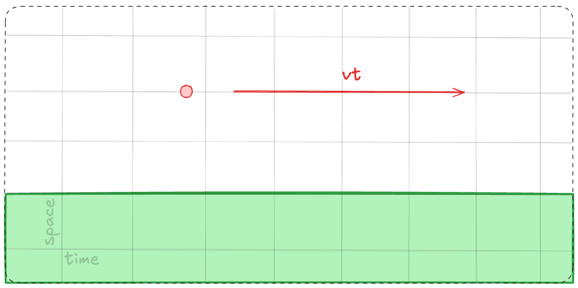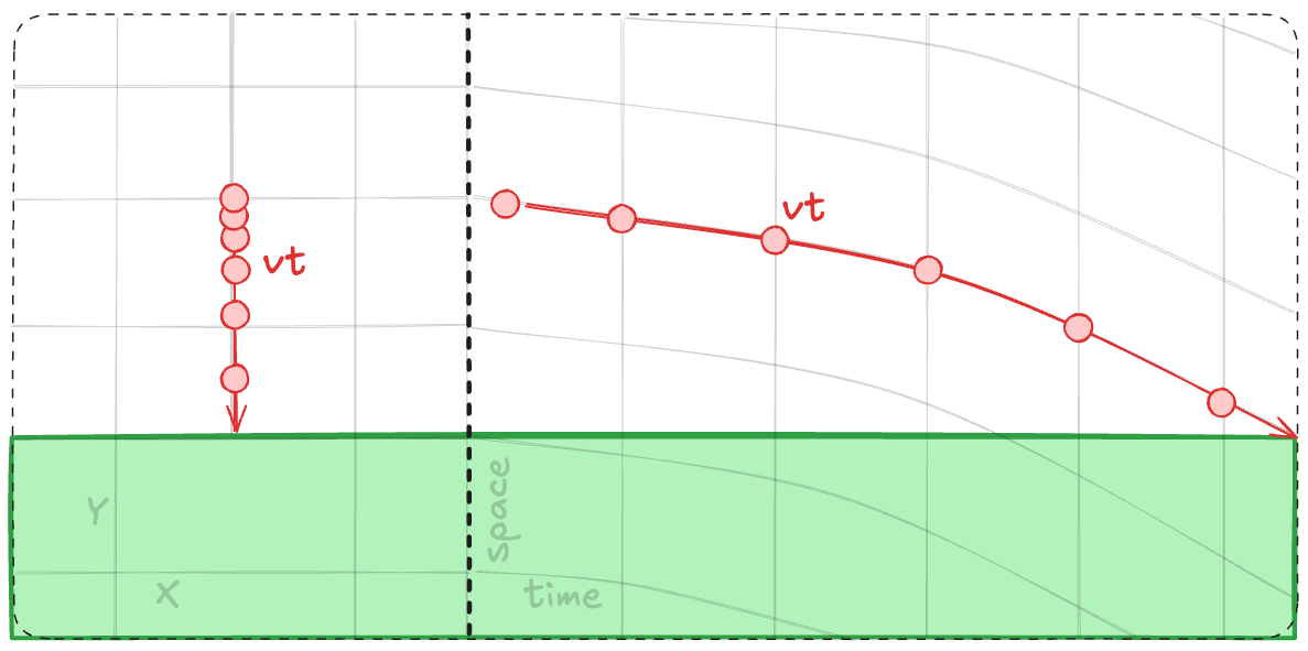 If you can’t imagine what the spacetime grid is representing. Think of the space axis as a page in a flip book, a 2D plane where the ball exists. The time axis is the multiple pages you can flip through.