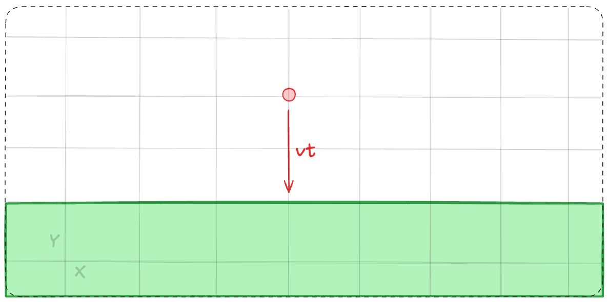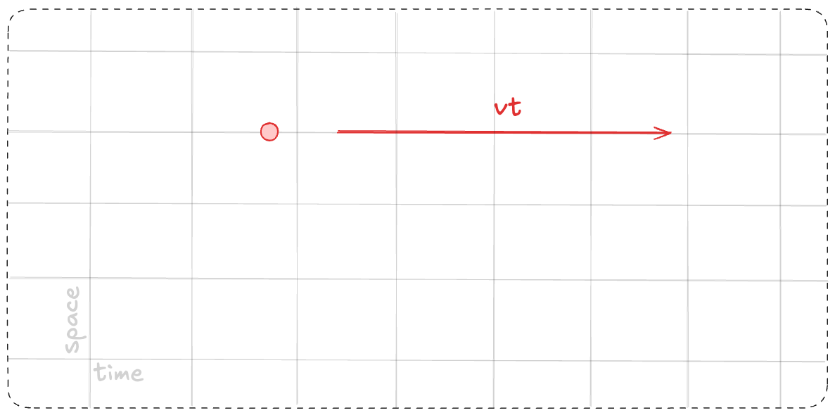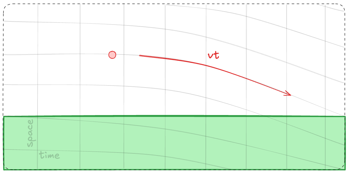 Let’s alter our diagram to show the ball’s temporal velocity. We are again drawing in 2D space, so this can be thought of as 2 + 1 spacetime. Lets also add the grid of spacetime so we can visualize it. The y axis is space and the x axis is time