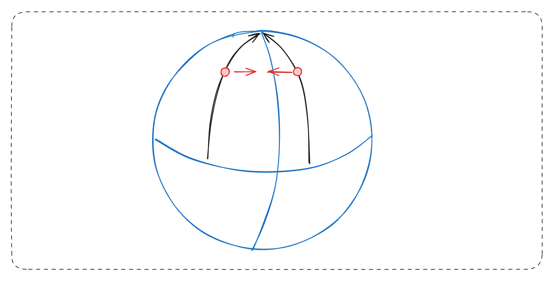 Just like the two people walking to the north pole felt like they were being pulled together, the ball now appears to have an unseen attractive force towards the earth.