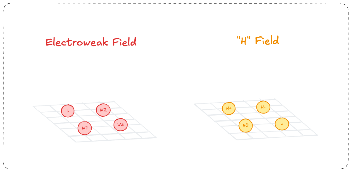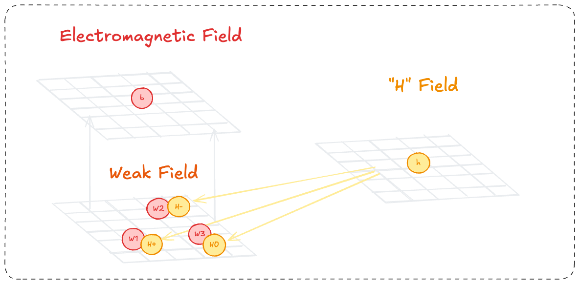 Another field also needs to have existed, which we will call the “H field”. This field is initially dormant, but spontaneously activates, bringing it’s own four bosons into play - H+, H-, H0, h