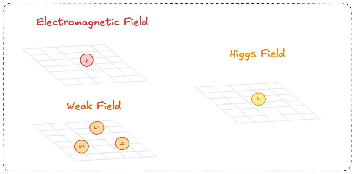 This results in three distinct fields - The electromagnetic, weak, and Higgs fields - what we see today.