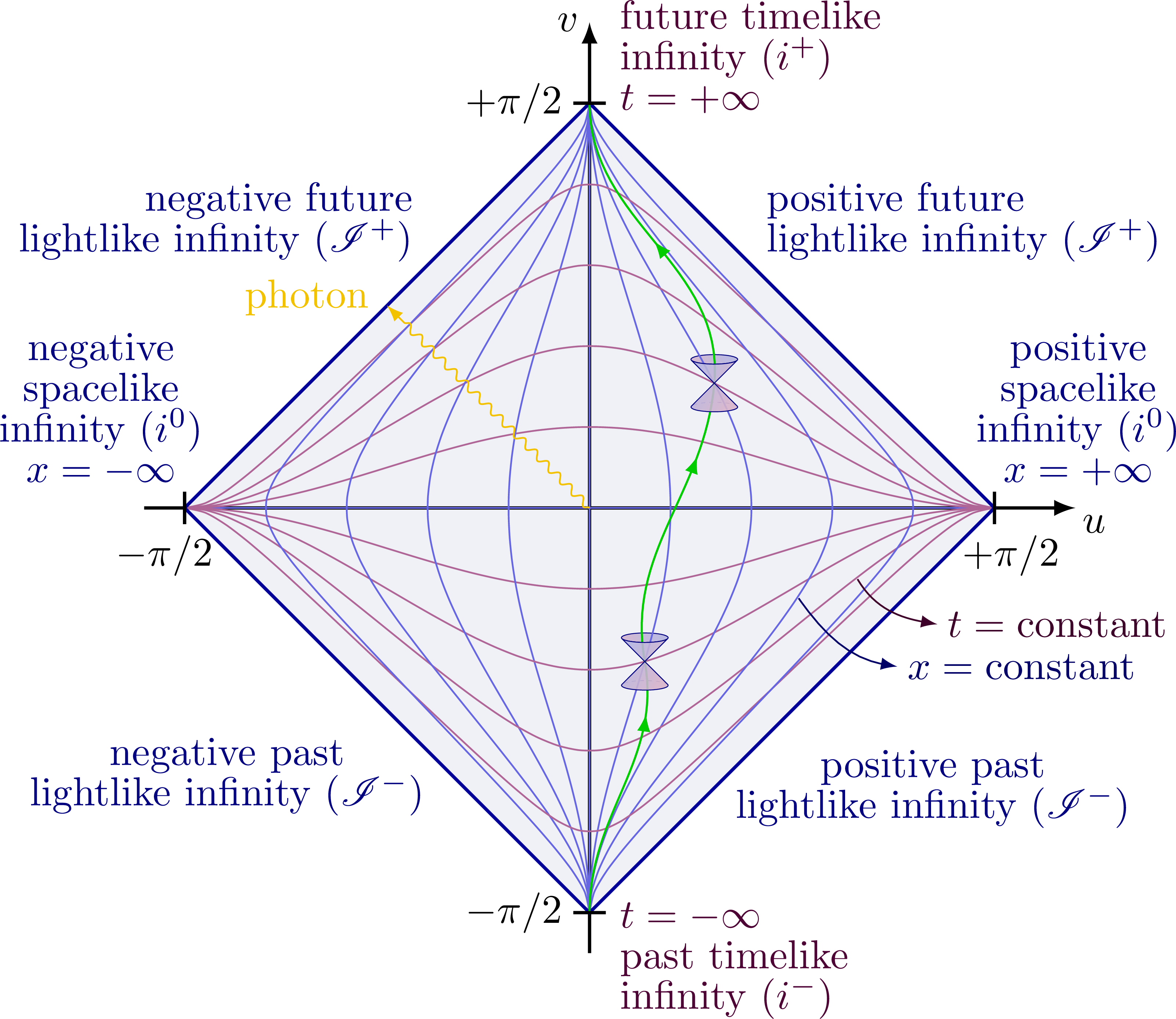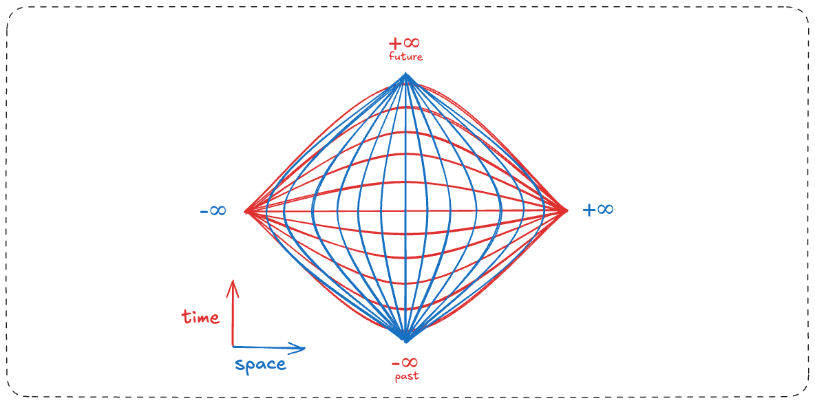 An important property is that it is conformal - the transformation preserves all internal angles, and angles between intersecting lines stay the same. Each “square” in the diagram represents the same “area” of spacetime.