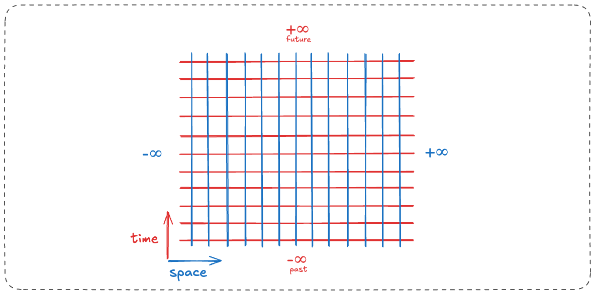 Each red tick represents passing time, and blue is a position in space. A similar grid is used for drawing Light Cones.