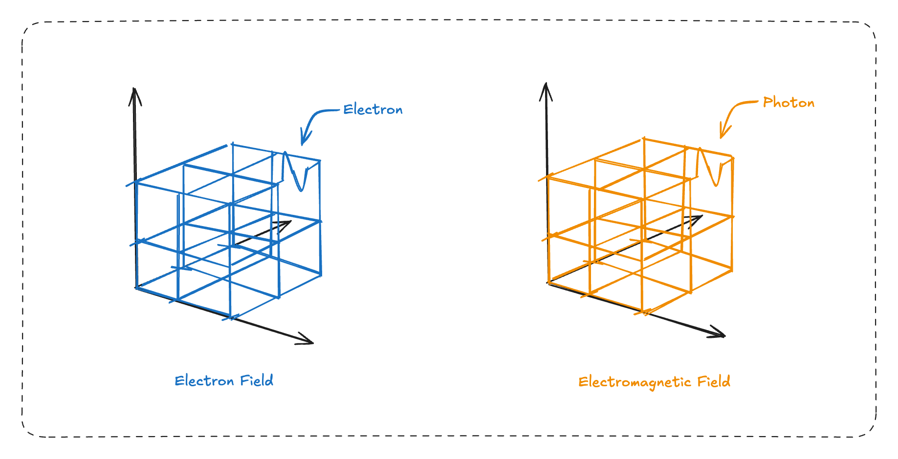 For example, an electron is an excitation in the electron field, while a photon is an excitation in the electromagnetic field.