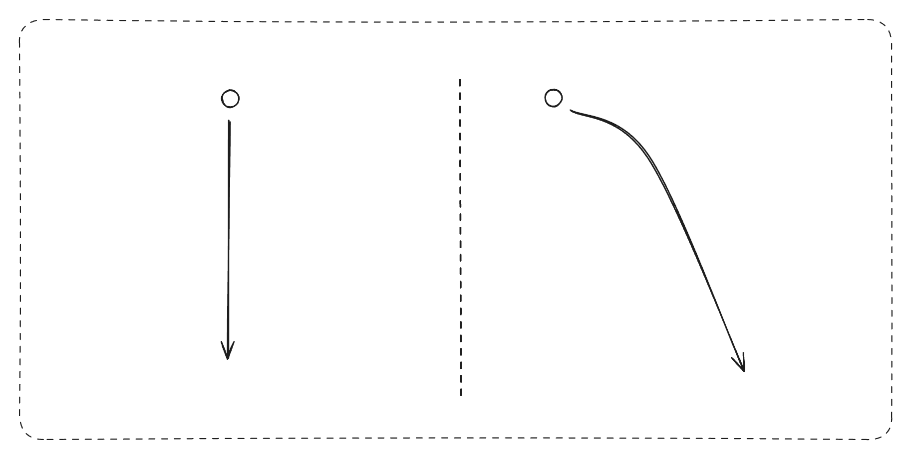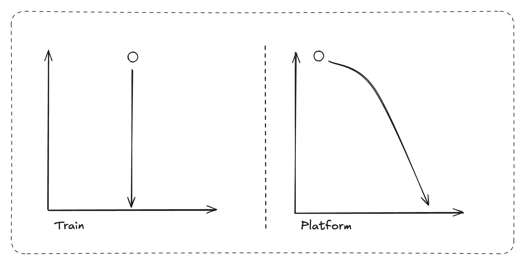 Suppose you are riding in a train and you drop a ball. For you, the ball falls straight down, but for someone standing outside of the train on the platform, the ball falls in an arc:
