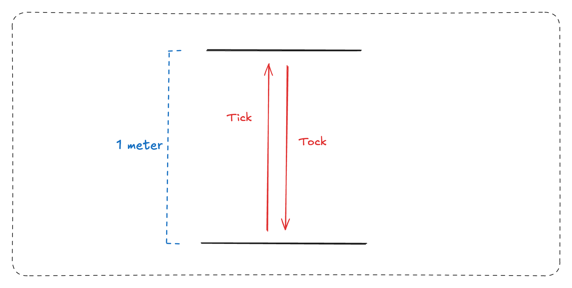 Lets create a very simple clock by positioning two mirrors 1 meter apart. If we send a light beam to bounce between the two mirrors, when it goes up that is a ‘tick’ and when it comes down it is a ‘tock’