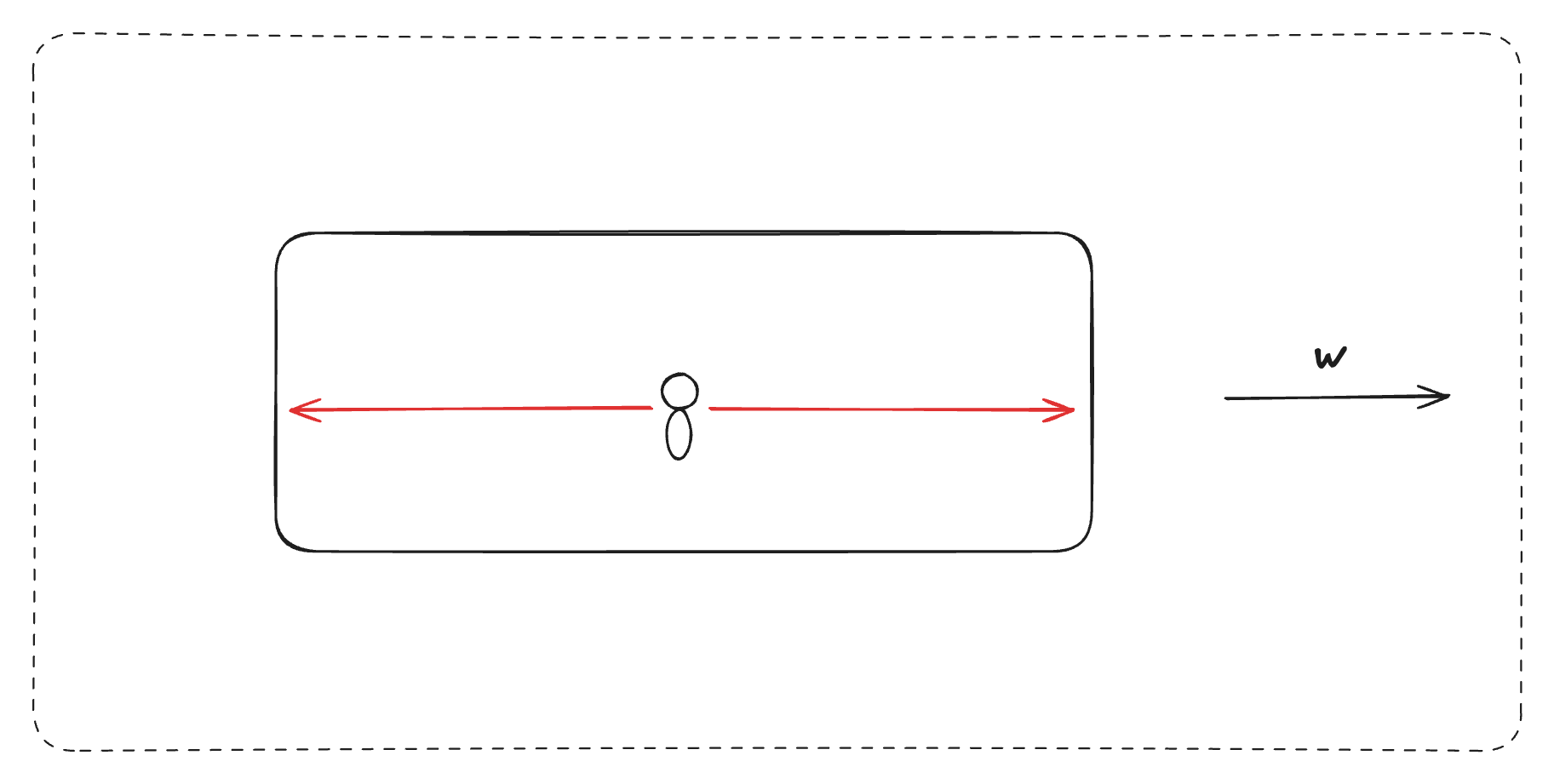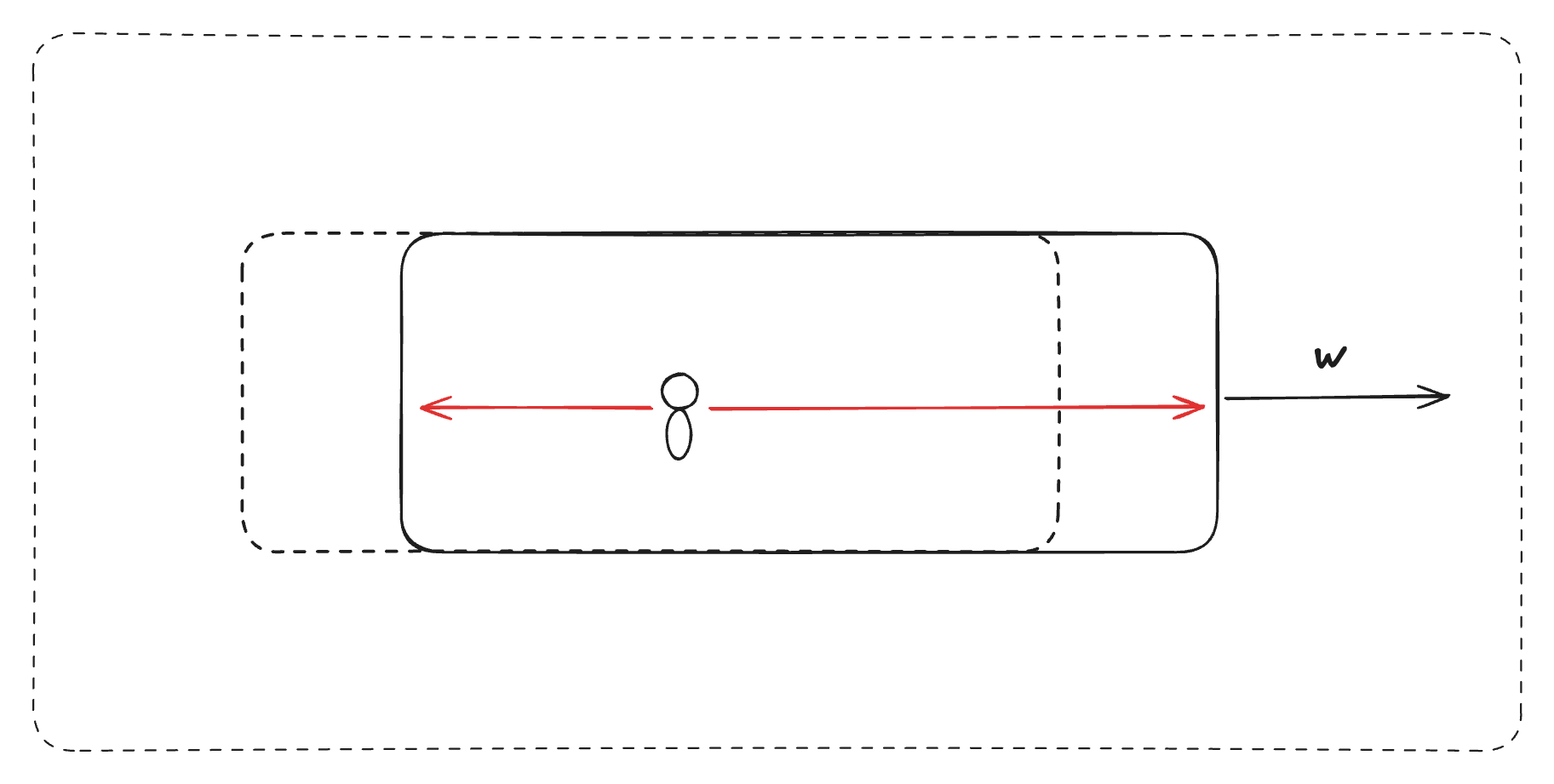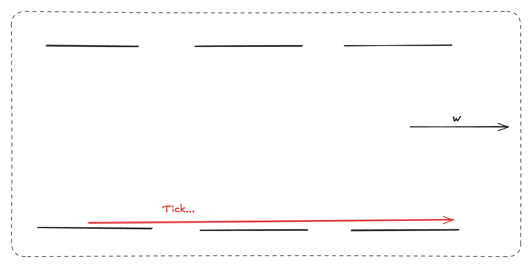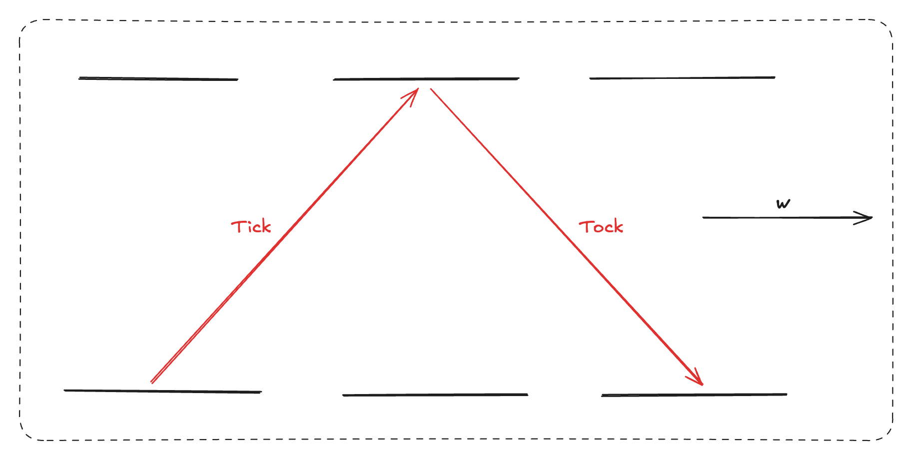 To make sense of this diagram, understand that the positions of the 2 mirrors are moving to the right at speed w in the duration of the tick-tock. The light now travels in a zig-zag from an outsider frame’s perspective