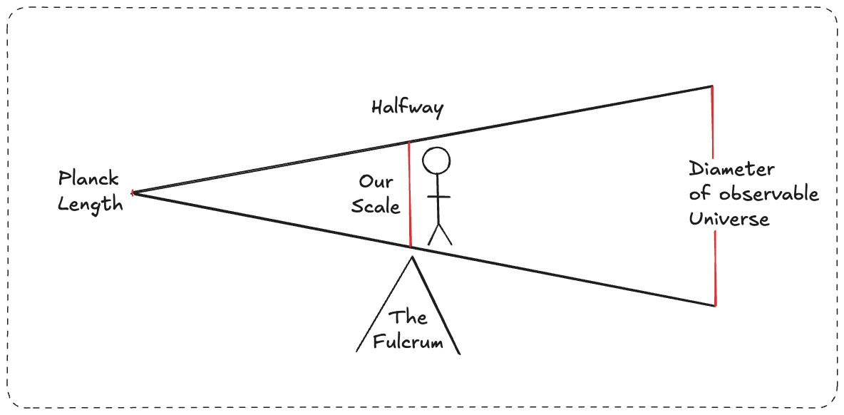 It’s neat to imagine that to calculate the current size of the unobservable universe, it could possibly be derived from the current scale of experience and the planck length - scaled upwards to the top.