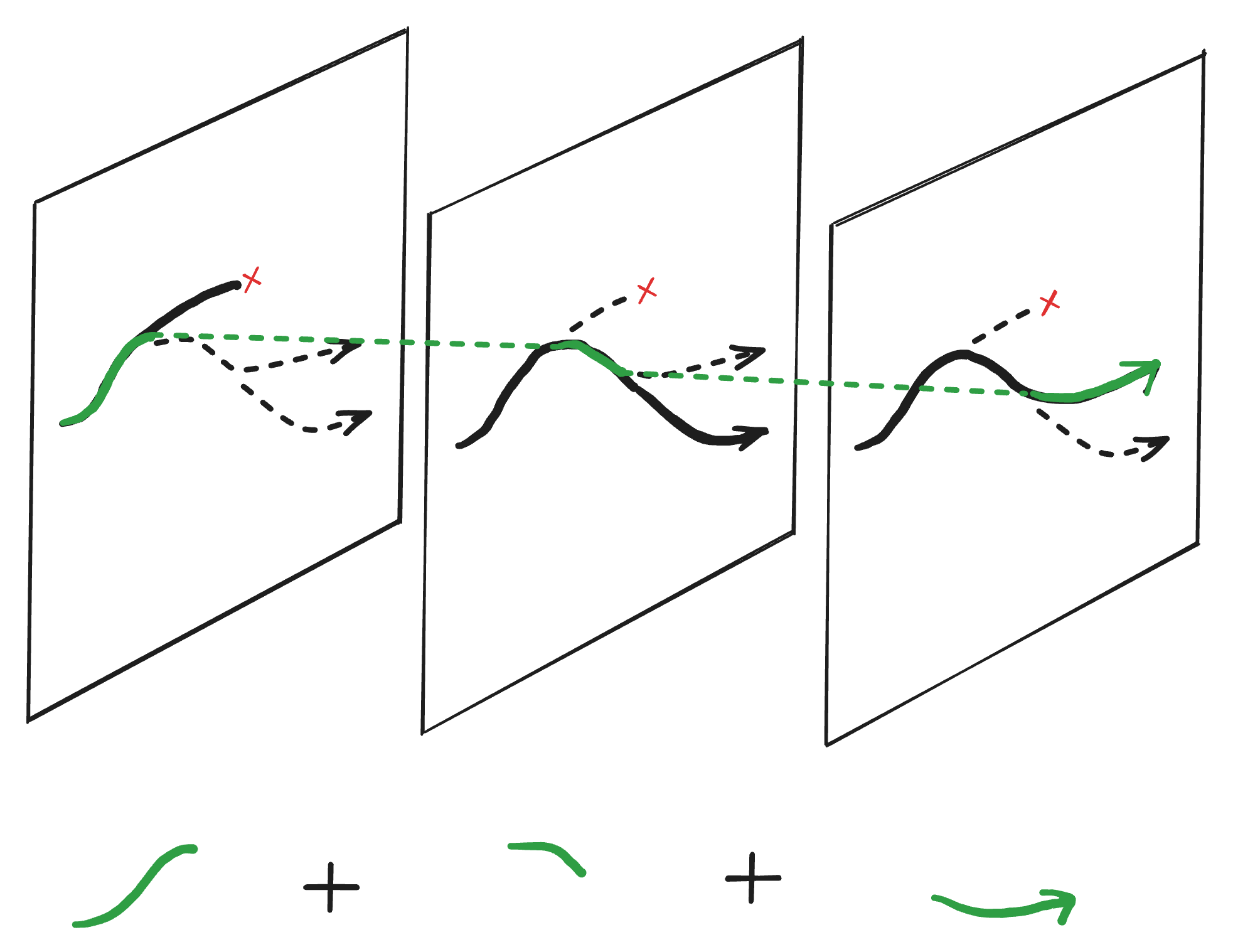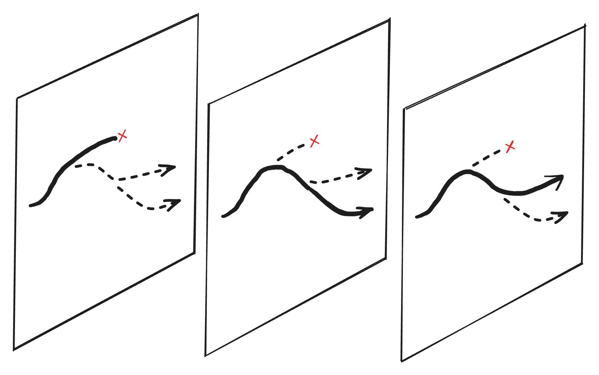 Instead of a straight timeline, imagine it curving through this plane of possibilities. Narrowly avoiding disaster at some turns, making regrettable choices at others.