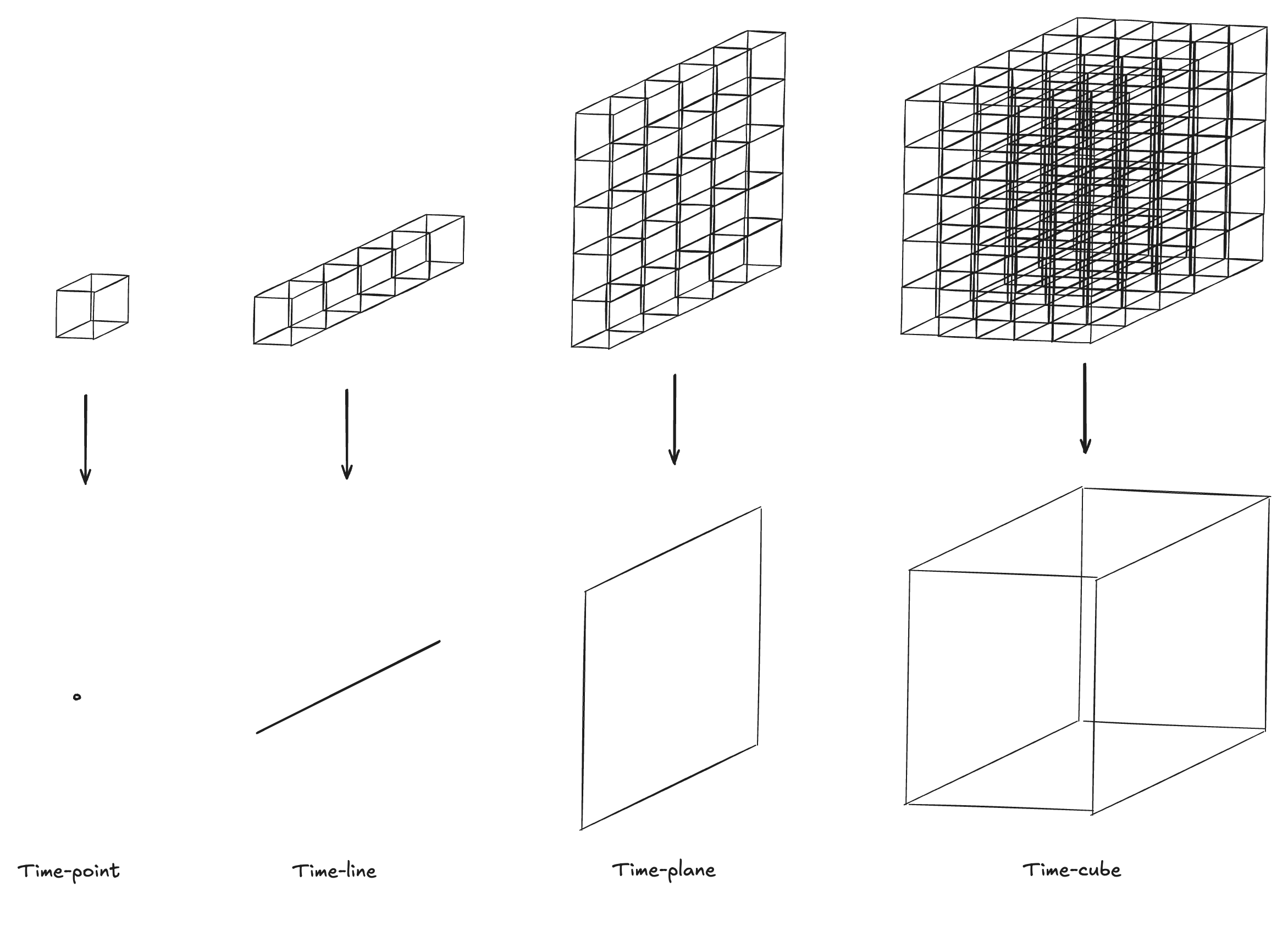 Take a time-plane and place another beside it. Fill the spaces between and extend. We now have another cube like structure, constructed of an infinite series of potential timelines organized in an infinite series of planes.