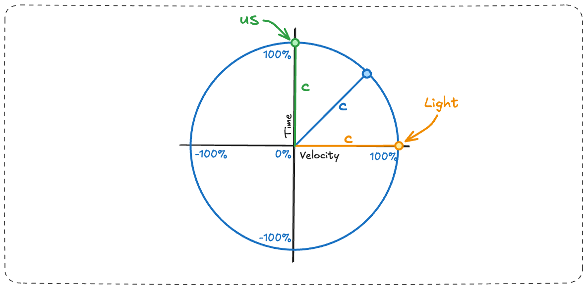 Light is at the furthermost right point of the circle, where it experiences no time and thus moves through space at it’s maximum speed.