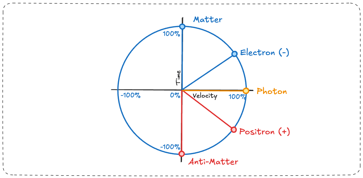 For example, an electron with a positive charge instead of negative is it’s antimatter pair, called a positron. The photon, which resides exactly in between the 2 halves of the circle since it travels at light-speed, is it’s own antimatter pair.