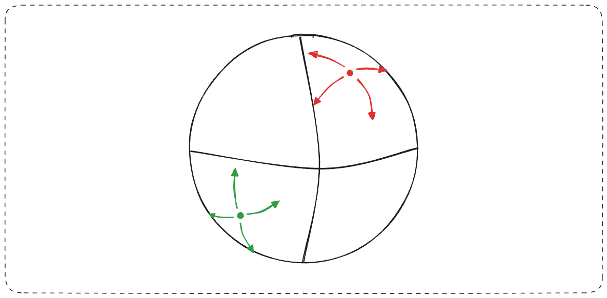 This inverse of a sphere is hyperbolic space. Instead of points converging at a pole, they diverge.